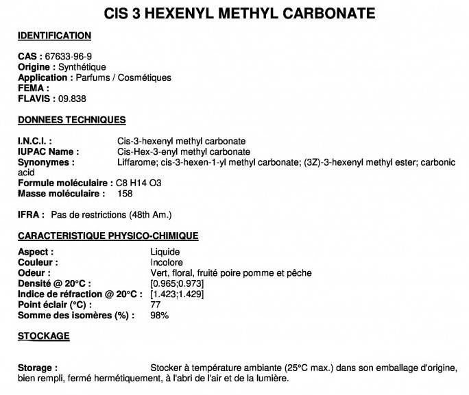 Наиболее эффективно использовать от следов до 1 %. В ароматах для помещений часто используется до 2 % , где требуется более интенсивное звучание. При более высоком содержании груша становится засахаренной, а травяной оттенок — лиственным и слегка восковым, что может соответствовать или не соответствовать вашей задумке. При концентрации 0,05 % аромат едва заметен, но при этом он всё равно усиливает другие верхние ноты.