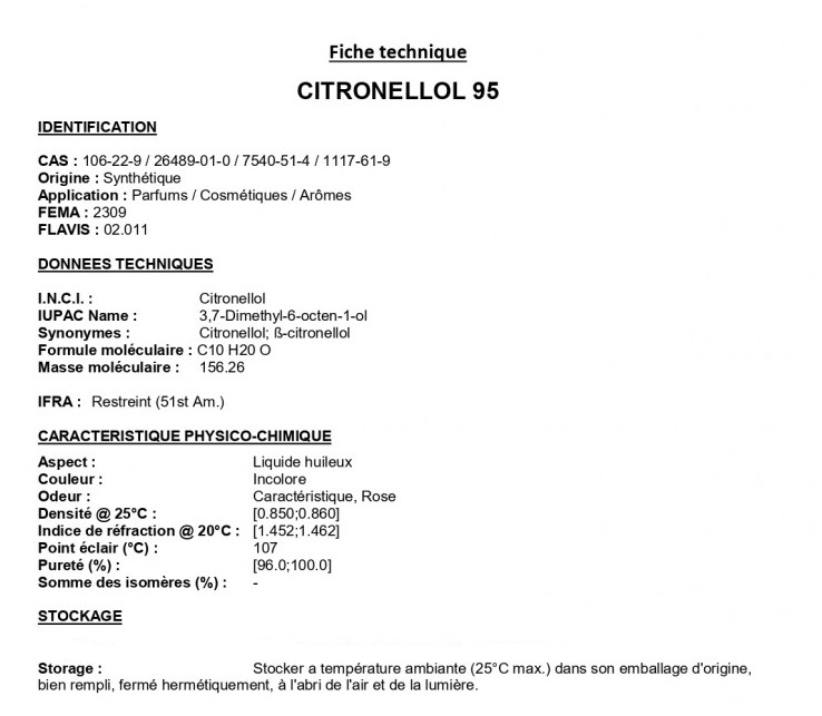 Цитронеллол 95 используется при восстановлении розовых ароматов, а также в цитрусовых нотах.