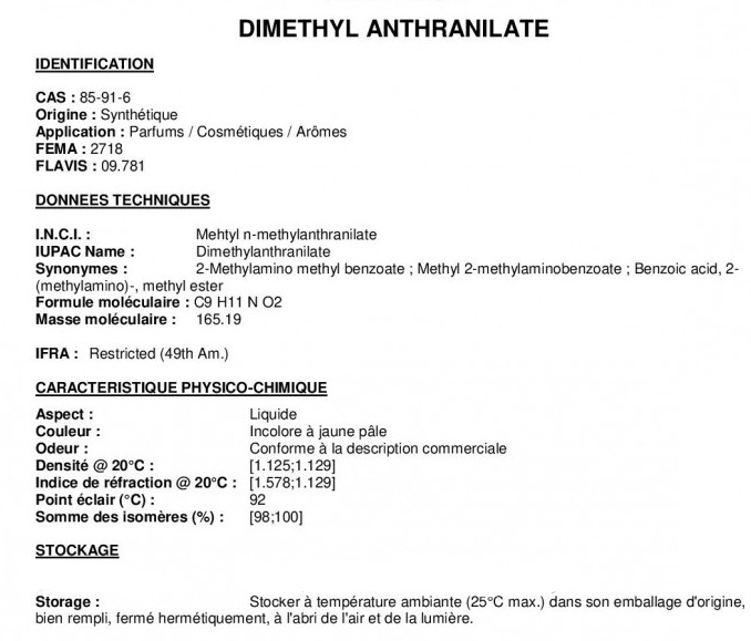 Диметилантранилат используется в качестве акцента флердоранжа или нероли в цветочных композициях, для придания изюминки одеколону. Органично сочетается с аккордами петитгрейна, мандарина и жимолости, смягчая острые грани и придавая аромату легкое цветочное сияние. Если, при работе с альдегидами, вам нужно избежать шиффовой основы, то лучше используйте именно Dimethyl Anthranilate. Рекомендуемая дозировка варьируется от незначительных следов до примерно 5 % концентрата.