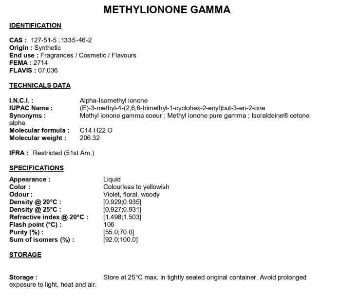 Универсальный компонент для модификации цветочных, лесных и кожаных нот. Незаменим в создании фиалковых и ирисовых композиций. Субстантивность: 125 часов. Ввод в парфюмерный концентрат: до 20%.