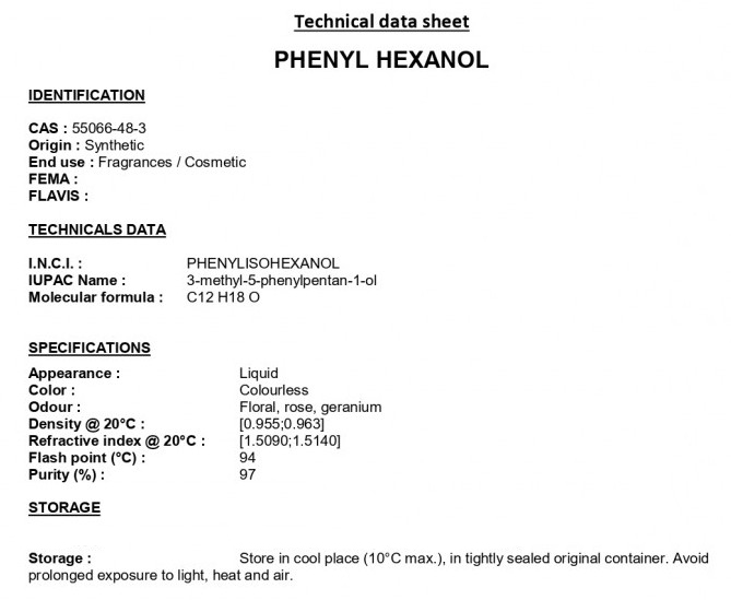 При нанесении на блоттер, Phenyl Hexanol раскрывается узнаваемым розовым ароматом, который кажется скорее мягким и естественным, чем резким. Через несколько секунд появляется свежий зеленый оттенок, напоминающий только что измельченные листья герани и влажную свежесть ландыша. Через несколько минут проступает нежная фруктовая сладость, нечто среднее между легким медовым ароматом и едва уловимым запахом тропических фруктов, придающая аромату приятную округлость, но не делающая его приторным.