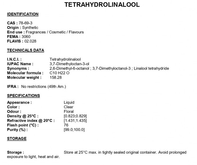 Тетрагидролиналоол — это возобновляемый растительный спирт, получаемый из линалоола, который пахнет свежей смесью бергамота, розы, лаванды и зеленого чая. Он легко сочетается с цитрусовыми, травянистыми, фужерными и древесными аккордами, выступая в роли тонкого связующего звена, которое придает яркость верхним нотам и сглаживает средние.